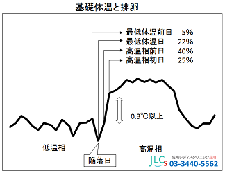 基礎体温と排卵日の関係 2016.10.20 排卵をすると排卵後の卵胞が黄体(実際に黄色くなります)に変化して黄体ホルモン(プロゲステロン)を分泌します。これが子宮内膜の着床の準備をするとともに、体温中枢に作用して体温を上昇させます。今回は基礎体温と排卵日について述べます。 よく体温がグッと下がったときが排卵日と言われます。決して間違いではないのですが、グッと下がったとき(陥落日)より翌日のちょっと上がりかけた日の方が排卵日である確率が高いのです(低温相最終日もしくは高温相前日)。しかし明日上がるか下がるかの判断は基礎体温表からだけでは難しいことです。少なくとも高温期になってからのタイミングでは妊娠率は上がりません。超音波検査や頸管粘液検査、排卵検査キットを併用する方が効率的と思われます。最近では排卵予測機能のついたスマホアプリで管理されている人も多くなりました。見る側としては手書きの基礎体温表の方が見やすいのですが…(^_^;)