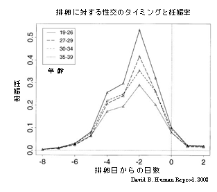 このグラフは比較的よく引用されているグラフです。排卵日からのタイミングと妊娠率示したものです。