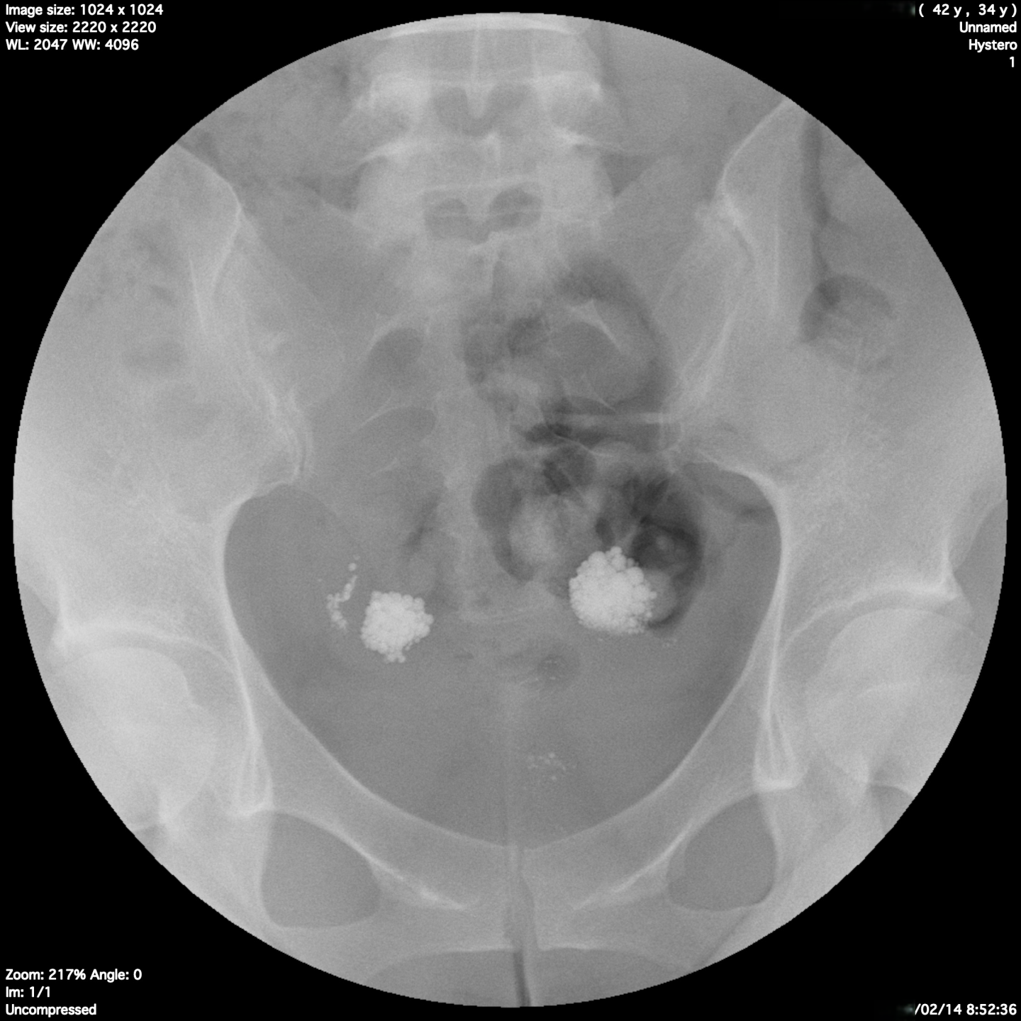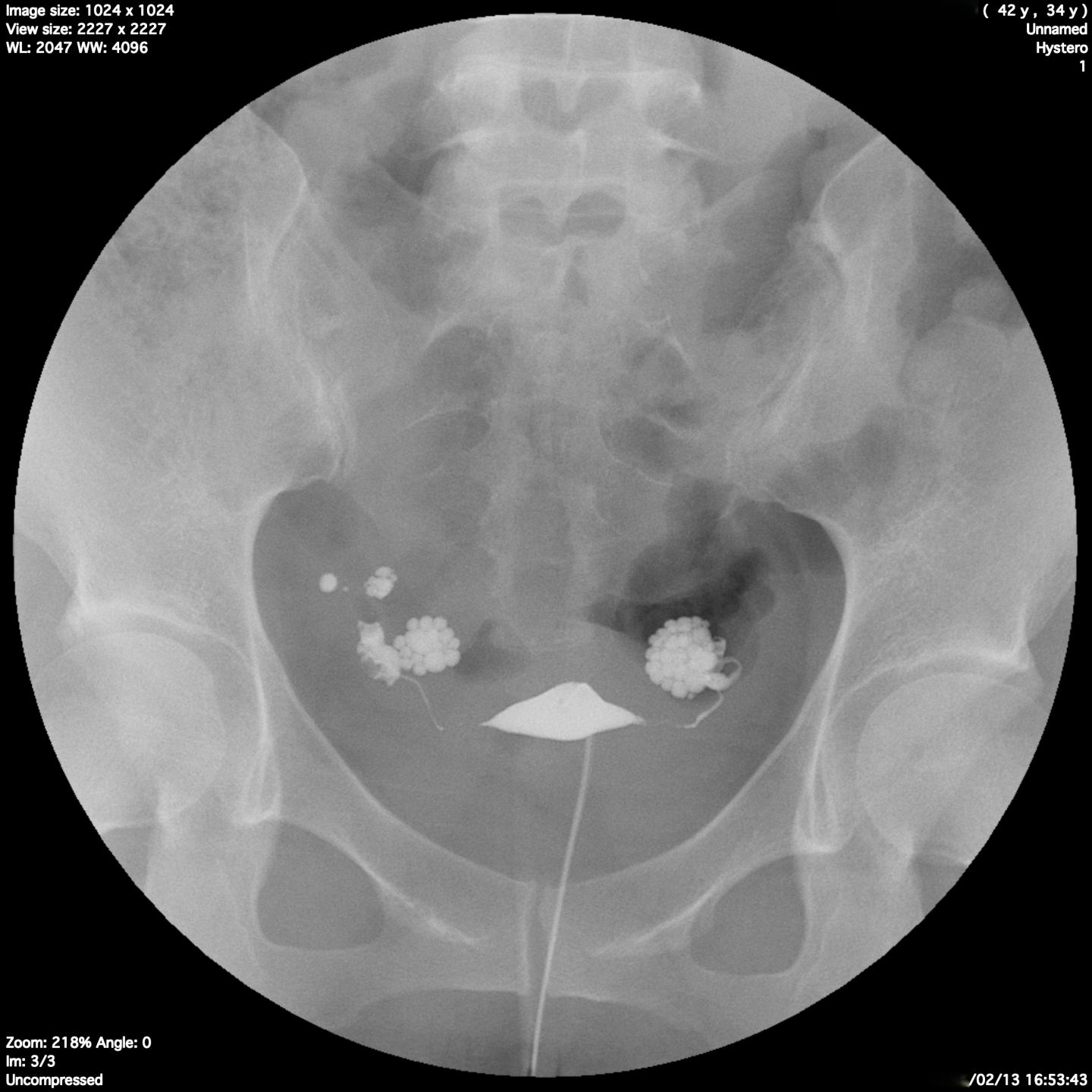当院でのクラミジア抗体検査ではIgG(+) IgA(+)を確認し、クラミジア治療を行い油性造影剤にて卵管造影を行った結果です。