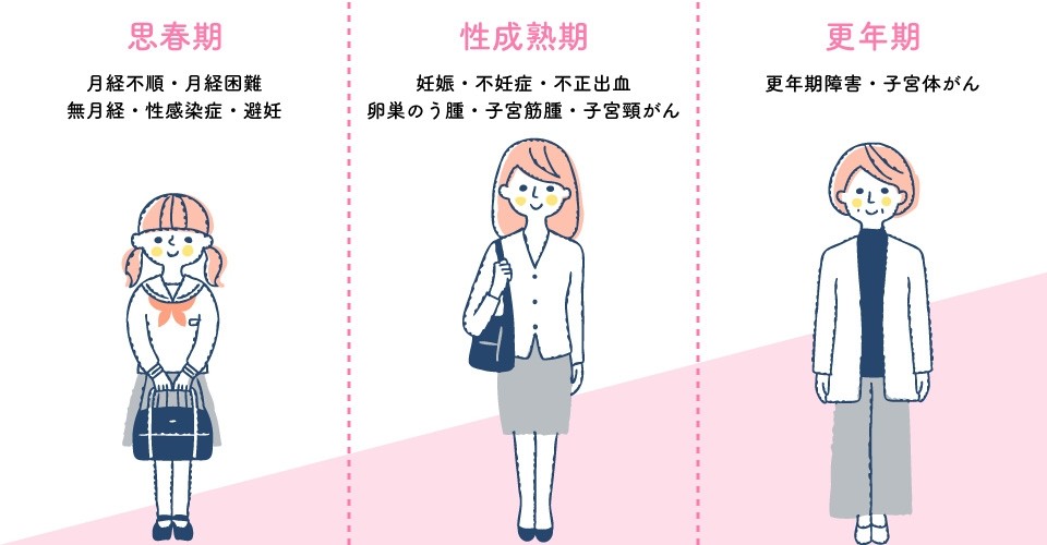 月経不順、月経困難、不正出血、おりものの異常、下腹部の痛み、体調不良やイライラなど、気になる症状があれば、気軽に受診してください。