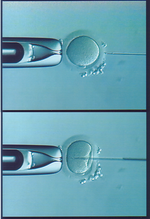 通常精子は精子自体の運動や酵素、免疫的な反応などにより卵子の透明帯(透明帯(卵子を取り囲む殻)を通過し、卵の細胞質に取り込まれます(受精)。しかし、極端に精子数が少なかったり、卵の透明帯や精子の機能障害により受精できない患者さんがいます。そのような患者さんに対して顕微鏡下で1匹の精子を細いピペットで吸い込み、それを卵の透明帯を通過して直接卵細胞質内に注入することにより受精させます。これを顕微授精(細胞質内精子注入法:ICSI)と言います。