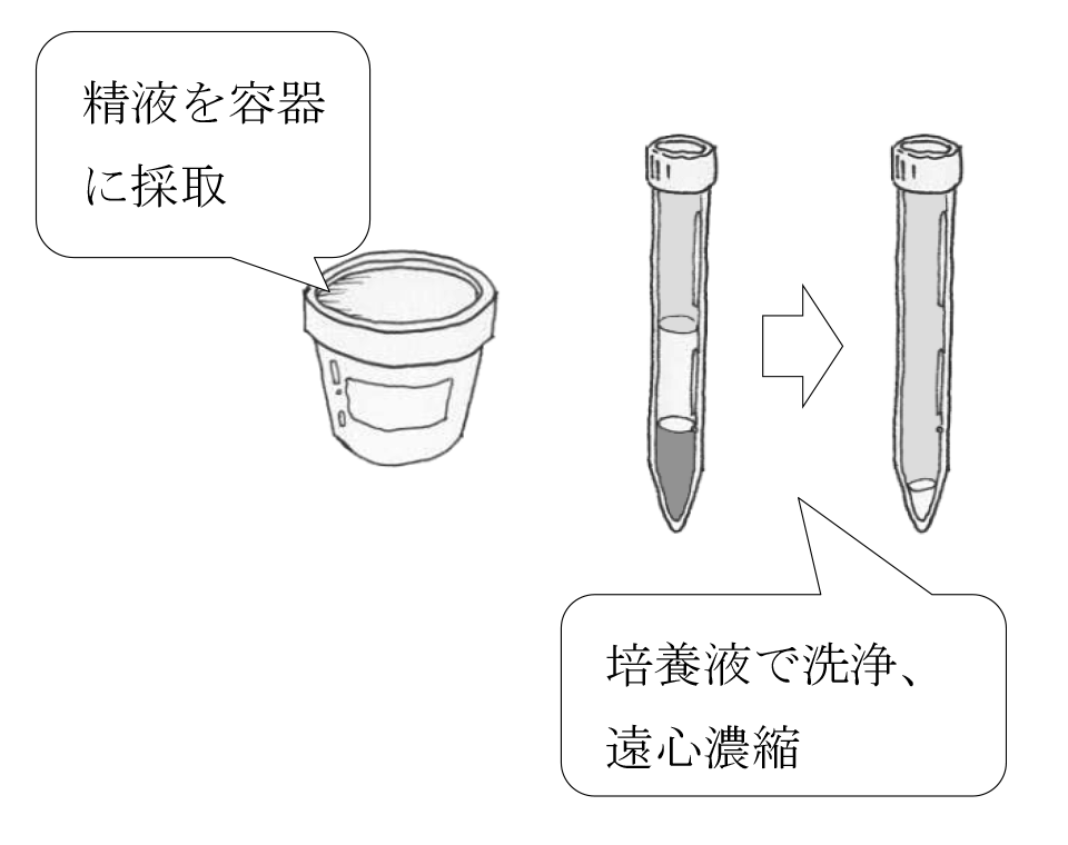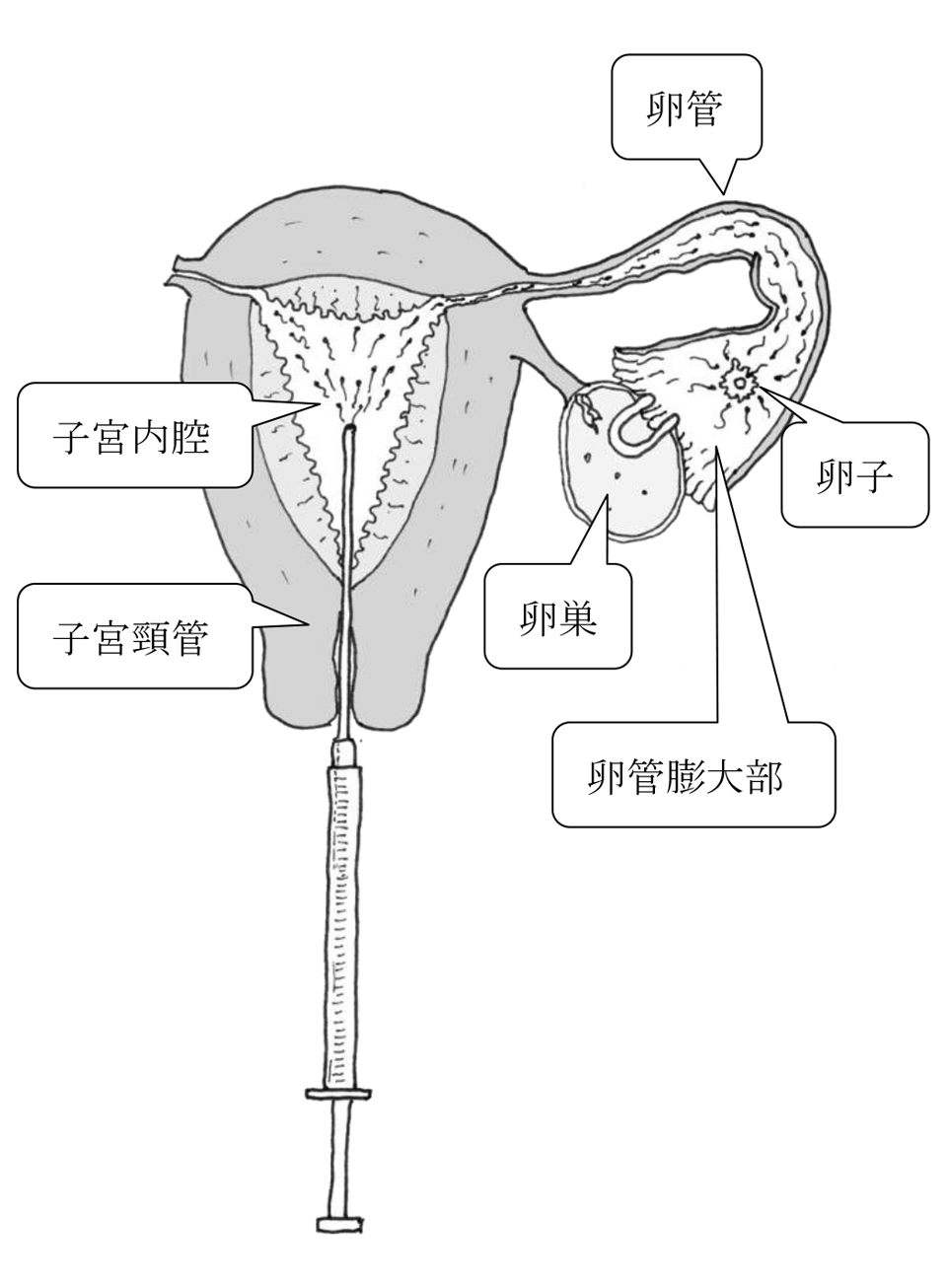 人工授精では2~3mlの精液中の精子を洗浄抽出し、0.5ml程度の量にまで濃縮します。それを排卵前日もしくは排卵日に子宮内腔に注入することにより精子の卵管への到達数を高めることを目的としています。精子は自力で卵管膨大部へ達し、自然と同じ状況で受精をします。